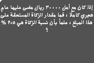 إذا كان مع أمل ٣٠٠٠٠ ريال مضى عليها عام هجري كاملًا ، فما مقدار الزكاة المستحقة على هذا المبلغ ، علماً بأن نسبة الزكاة هي ٢،٥ % ؟